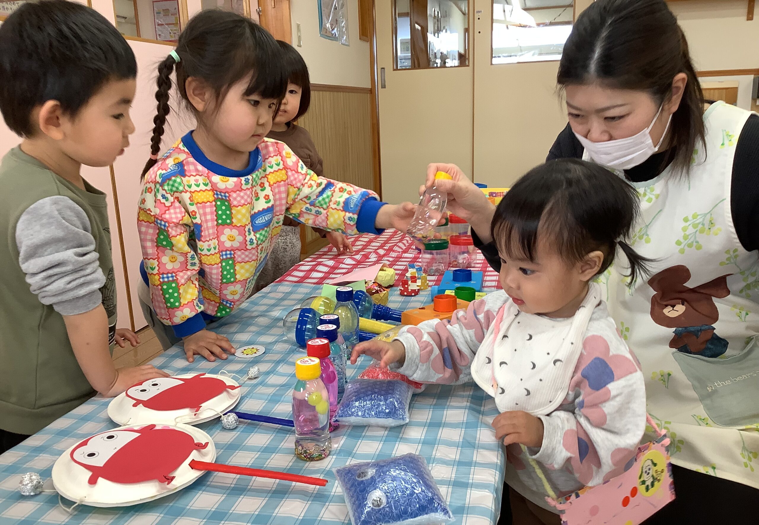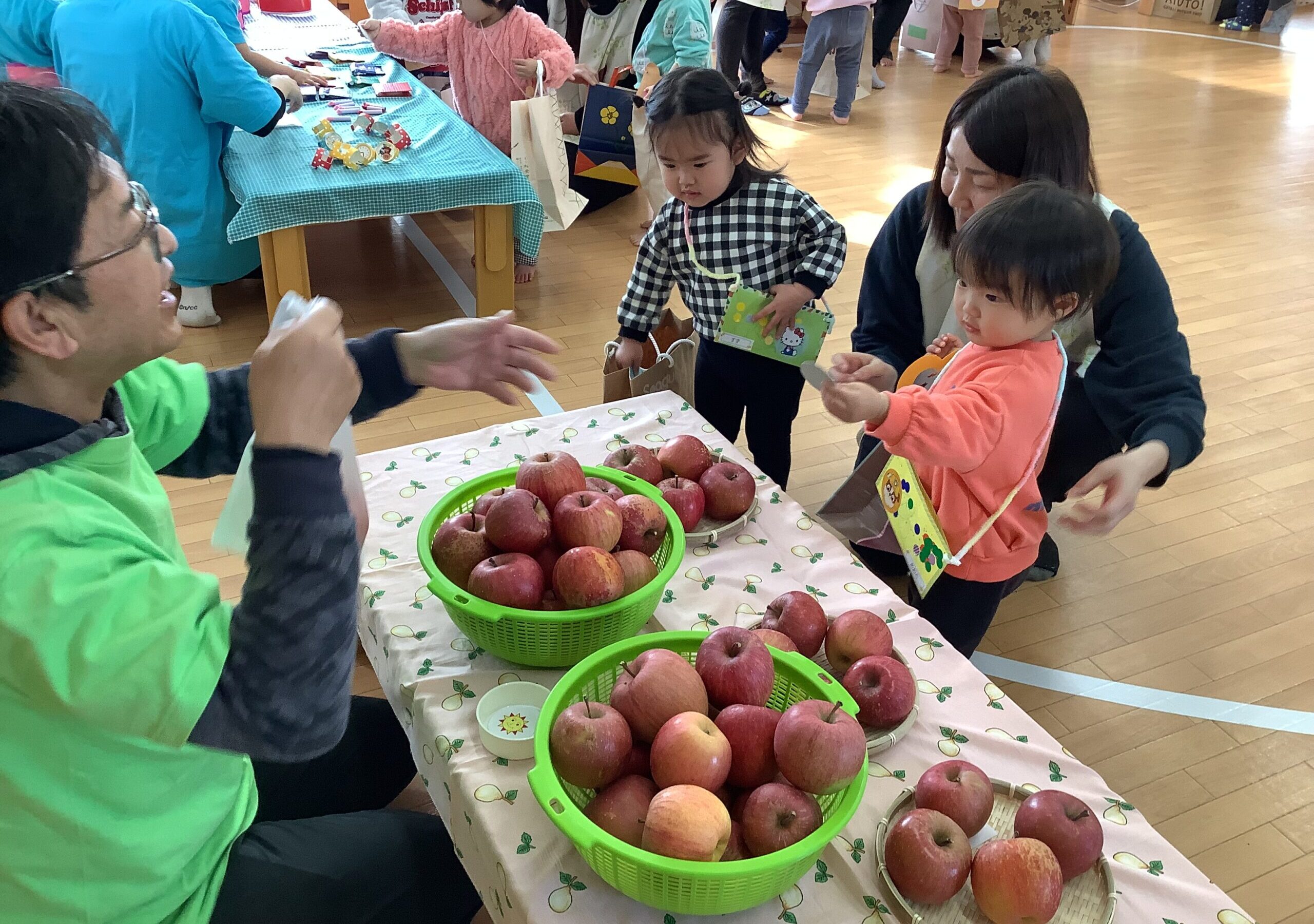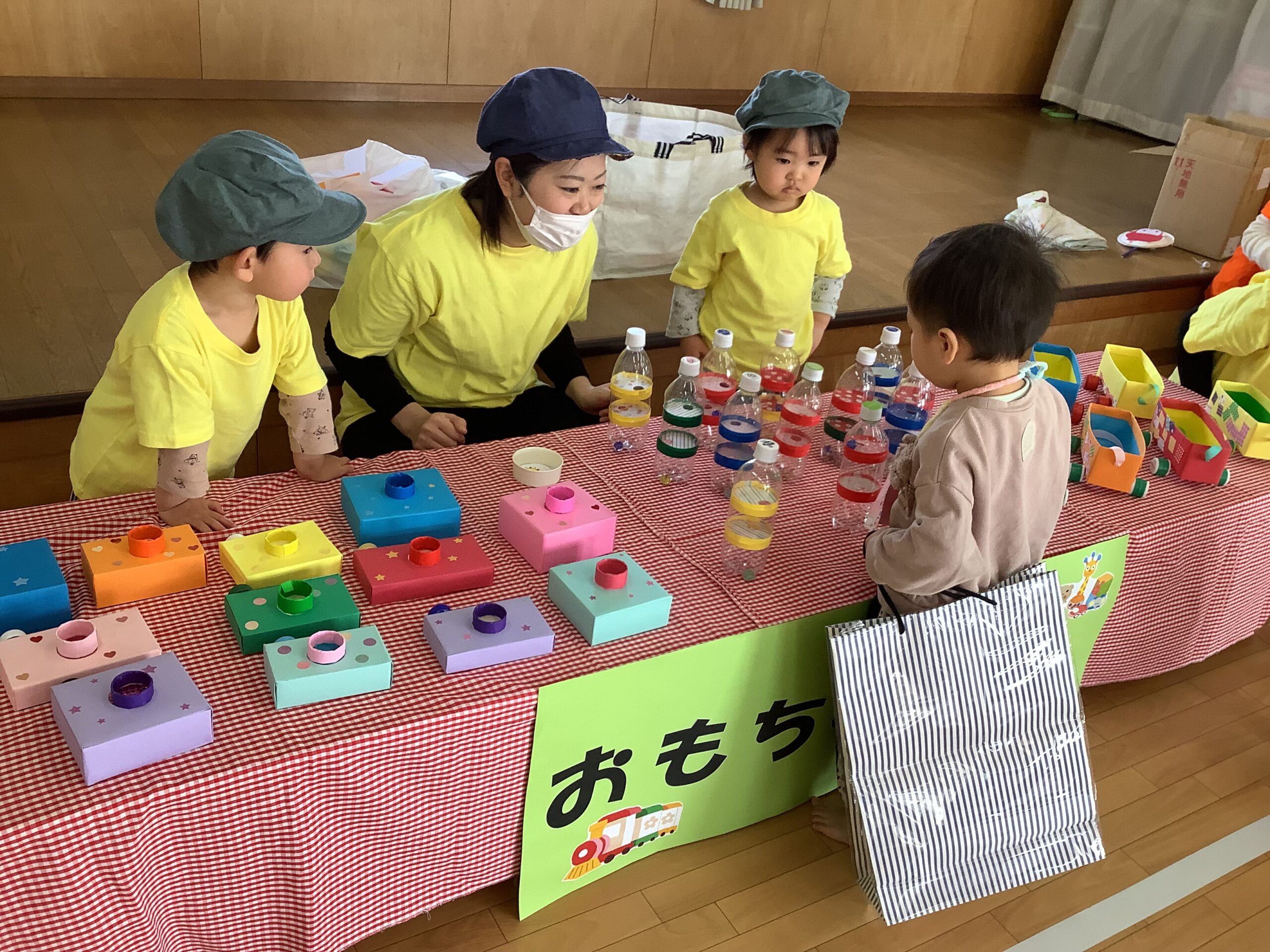 2歳児(ぱんだ組)さんは店員になり、1歳児(うさぎ組)さんはお客さんです。