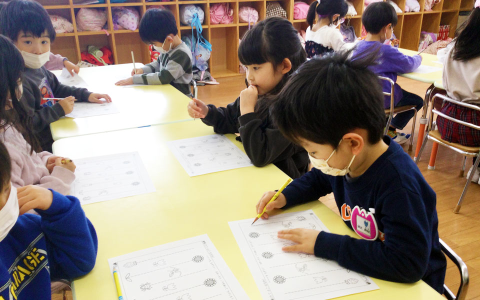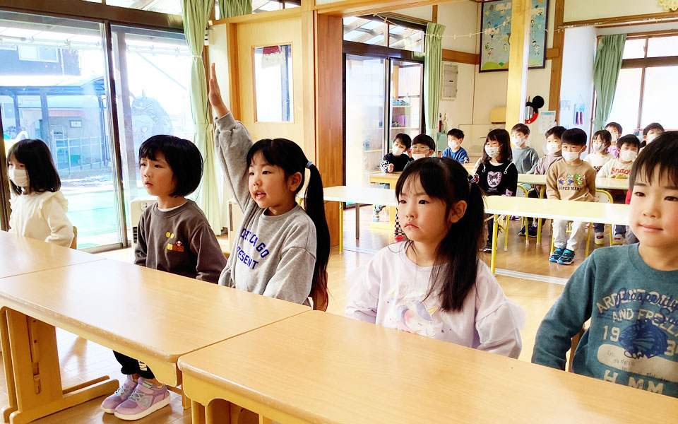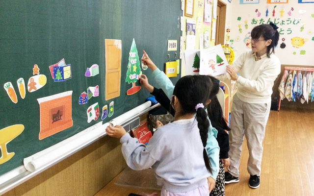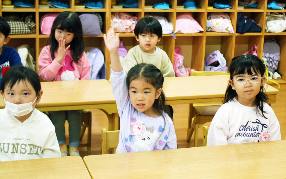 日本人講師による「英語で遊ぼ」の時間は、年間計画に合わせて、楽しく英語に触れる時間として各学年(学齢)に合わせてのレッスンとなります。1年のまとめとして英語の歌や英語劇、英語暗唱も行います。(みどりご園・さくら幼稚園)