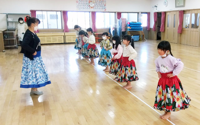 可愛らしいハワイアンの衣装を揃えています。発表会などの演目として取り入れ、今では専門講師の方に直接指導して頂き、先生たちも一緒に学んでいます。(さくら幼稚園)