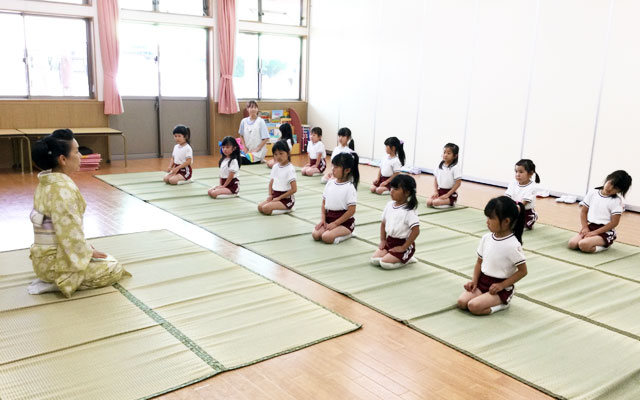 年長児になると男女とも、日本の伝統文化を学ぶ機会を作っています。伝統的な立ち居振る舞いを学ぶことは、社会性を育て日本人としての誇りを持てるようになります。茶道教室も行います。(さくら幼稚園)
