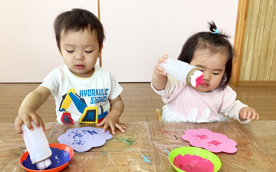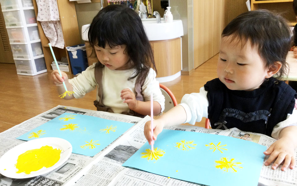 笑い声が絶えず子供たちは実に楽しそうに、びじゅつに取り組んでいます。学年に合わせて工夫された教材が多彩で、幼い園児たちが約1時間も熱中して取り組んでいる様子は驚きです。(みどりご園・さくら幼稚園)