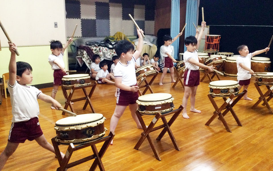 さくら学園では、小学生チームの「登米春嵐太鼓」が活動しています。その活動の始まりは、園でのリズム活動の日本太鼓です。指導は、プロの方に指導を受けている職員を中心に創作太鼓や伝承太鼓にチャレンジしています。(みどりご園・さくら幼稚園)