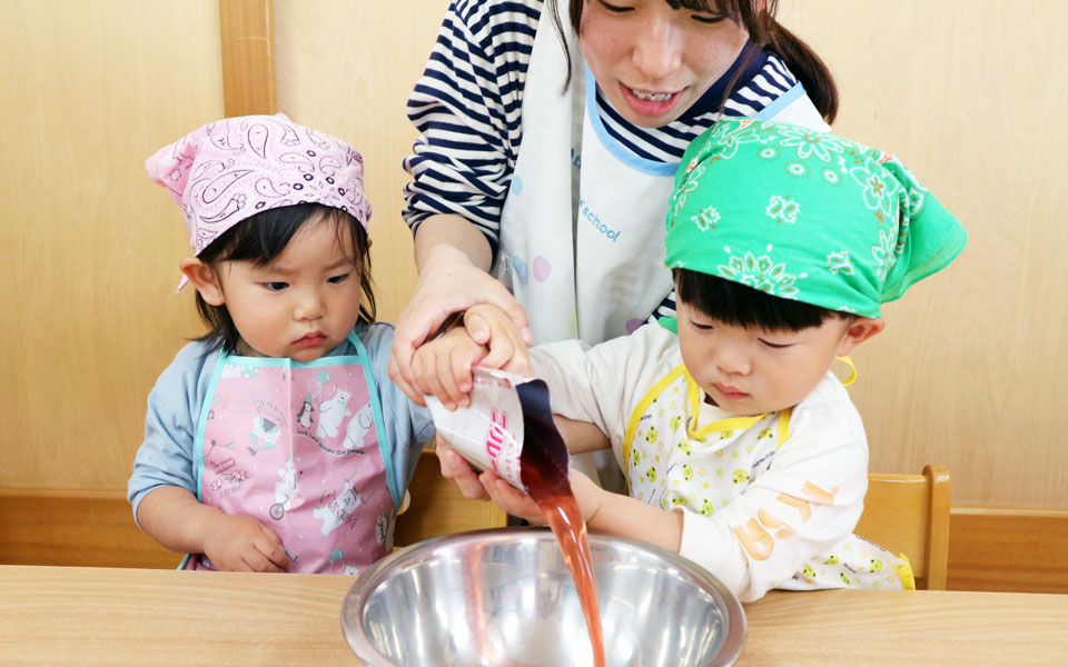 - 作る人と食べる幼児のお互いの顔が見え、食べる様子を見たり会話できる給食を提供する。