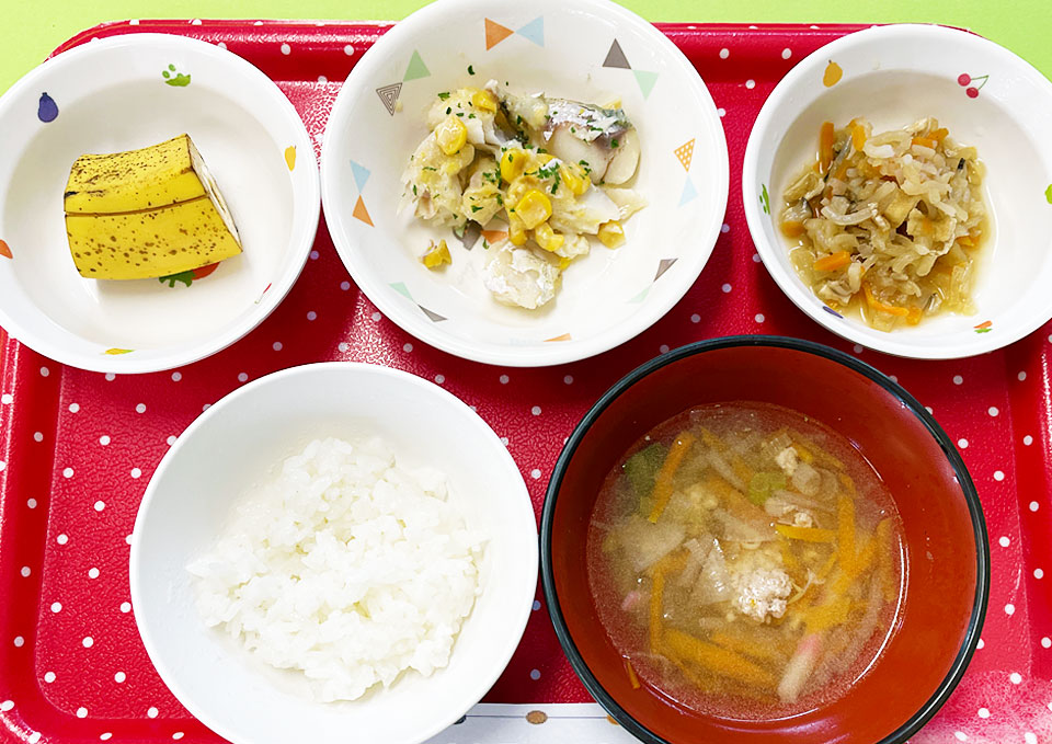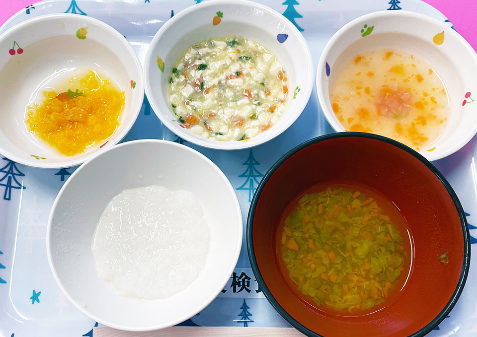 献立はご飯と味噌汁を基本とした和食中心。旬の野菜や地元産の新鮮で安心安全な食材を使用し、薄味で家庭的な味付けを心掛けています。離乳食は乳児の発育にあわせて素材を工夫しています。※アレルギー食にも対応しています。(所定の申請必要)
